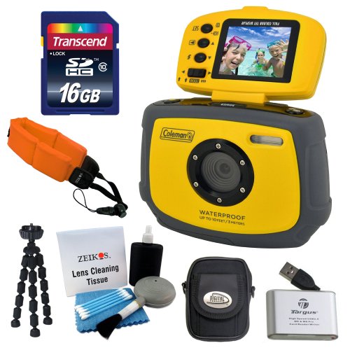 The Coleman Xtreme C4WP digital camera is the perfect camera for young teens and children. The camera is waterproof up to 10-Feet making it perfect for swimming pools and water parks. It is shock resistant and has solid rubber housing making it extremely durable. The camera features a 1.8" flip up LCD screen and boasts an 8x digital zoom. The camera also has 12 mega pixel resolution, automatic face and smile detection and VGA recording. The memory is expandable up to 16GB using an SD card (separately purchased). This camera is rugged and has a easy to use interface making it perfect for active kids.*16GB Class 10 SDHC Card